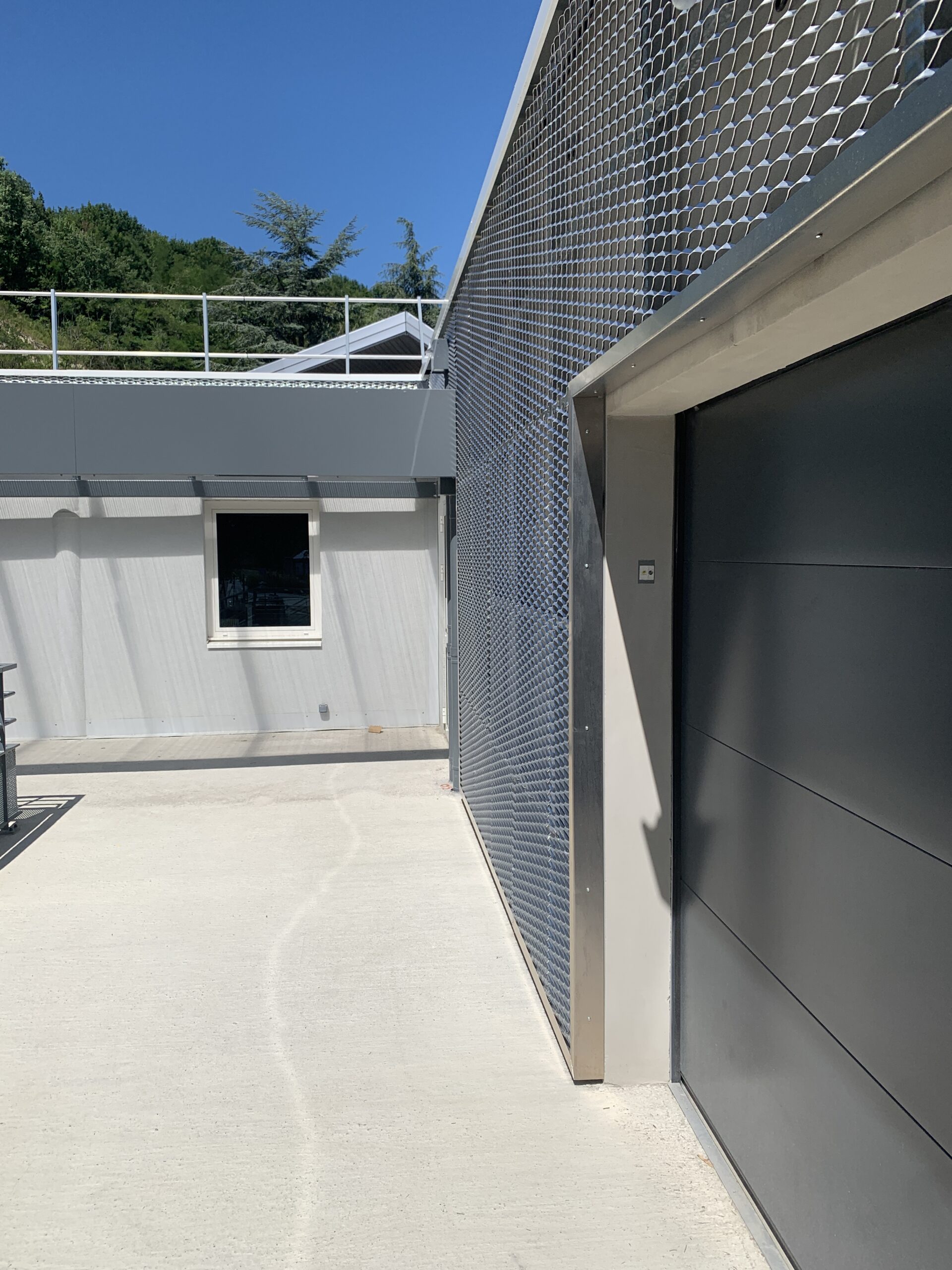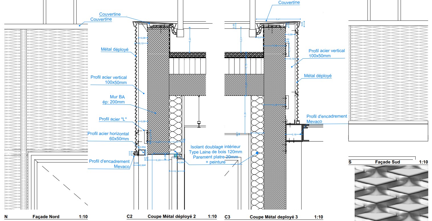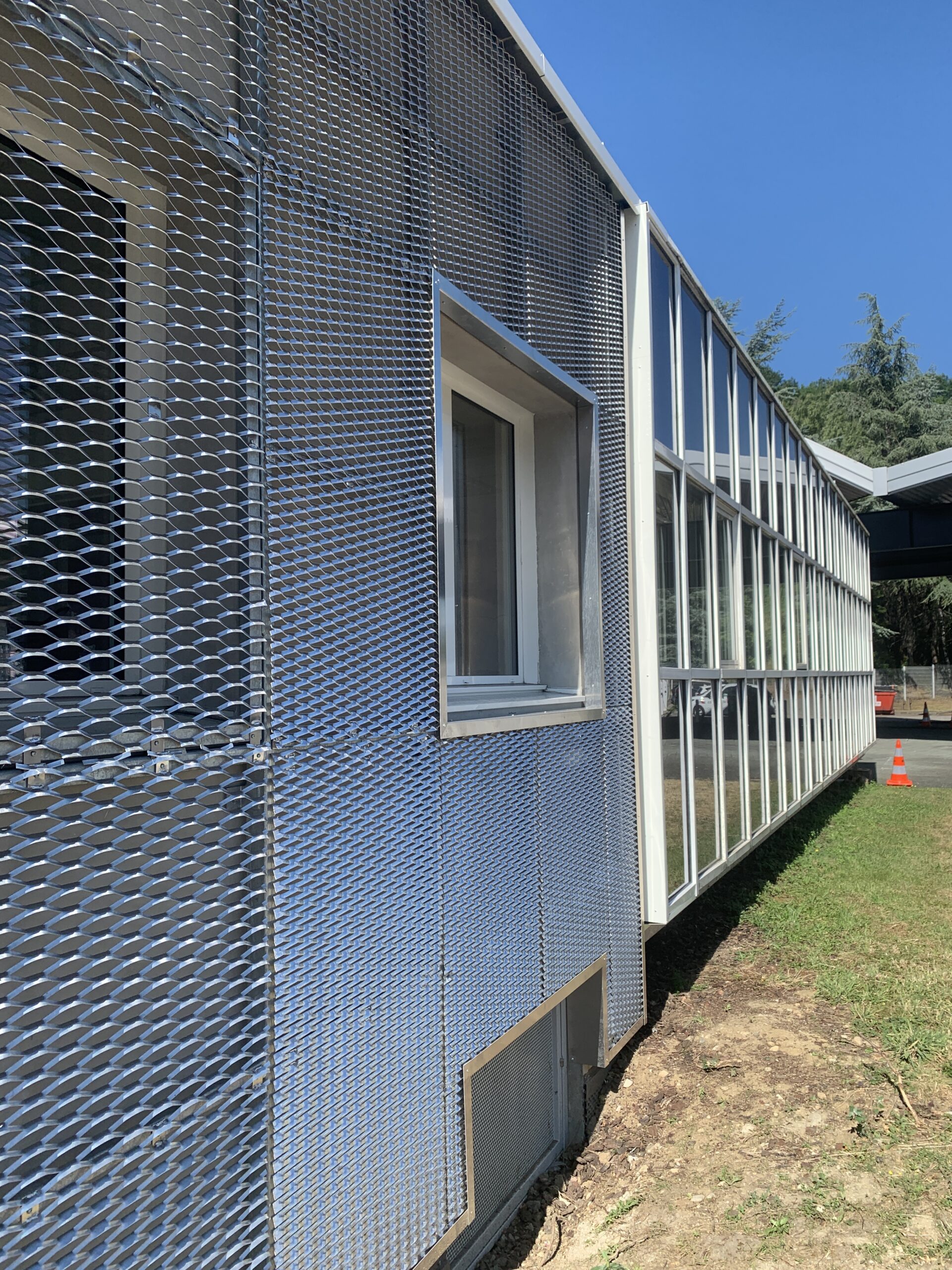 La nouvelle façade a ainsi été conçue à partir d’un bardage en métal déployé, dont la trame et la composition prolongent les lignes directrices et les proportions du bâtiment d’origine.