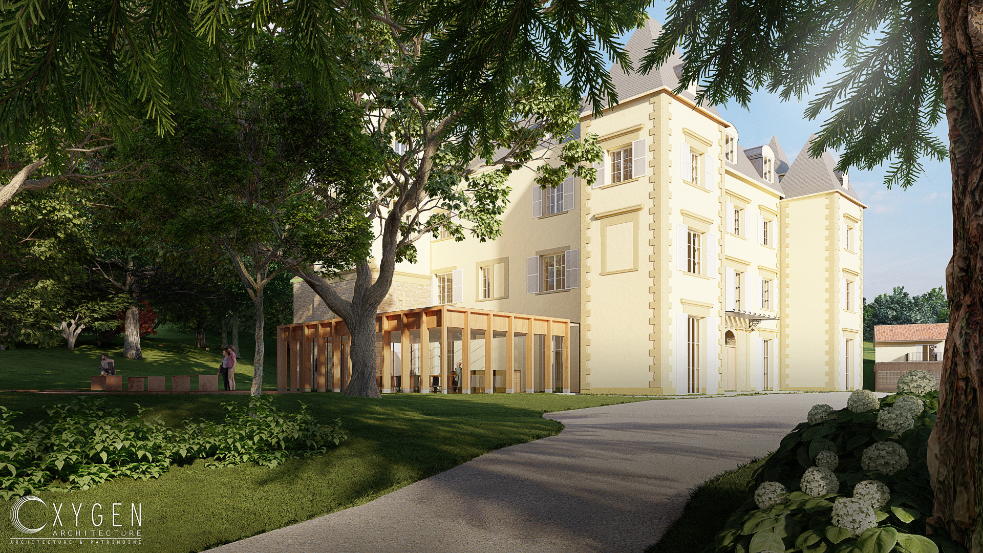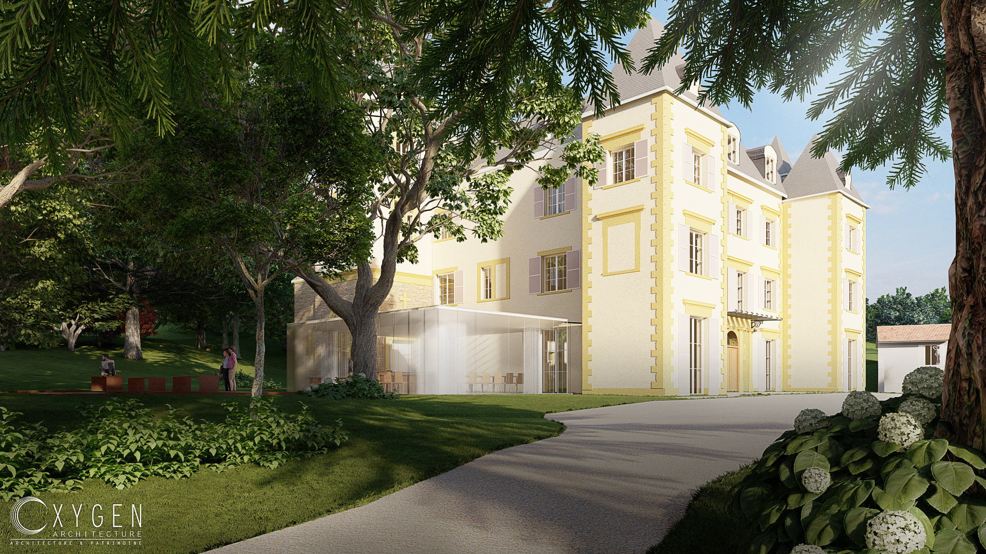 • Château : création d’une extension dédiée à la salle de séminaire, aménagement de places de stationnement, installation d’un local technique, d’un ascenseur et d’une marquise.