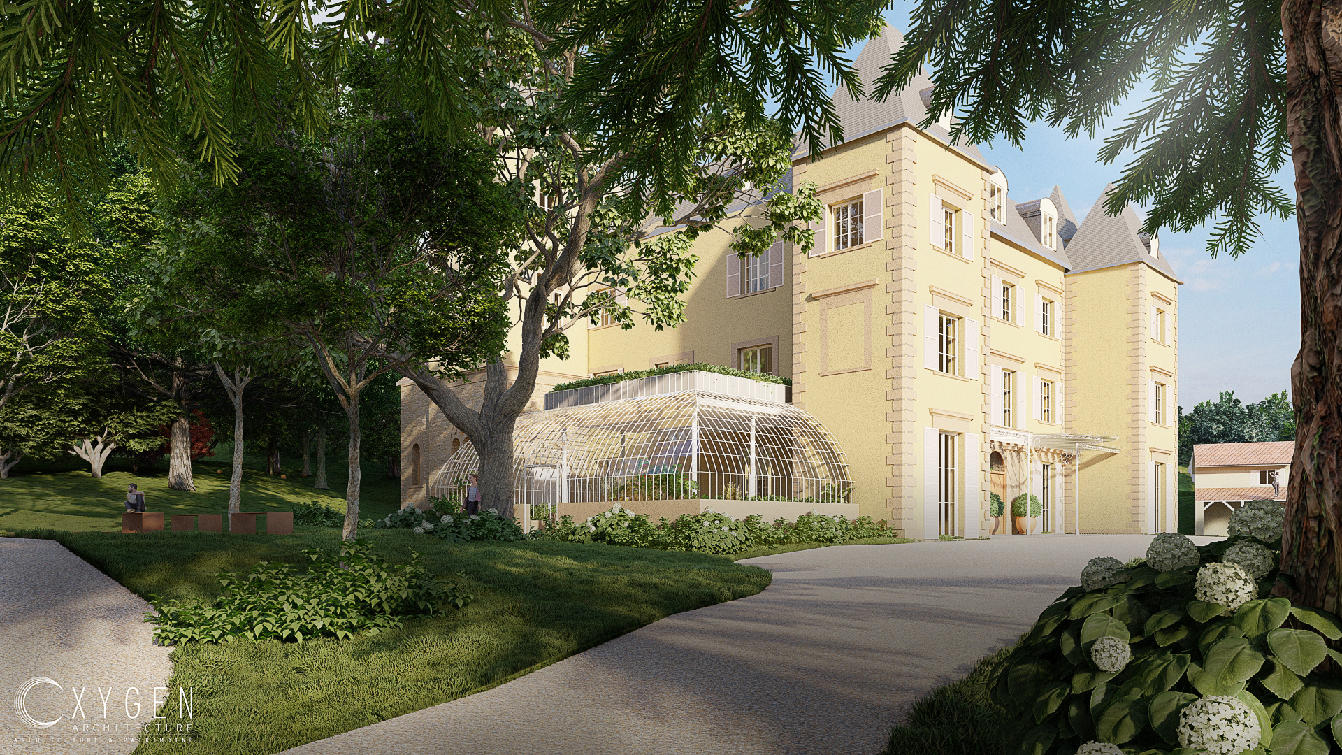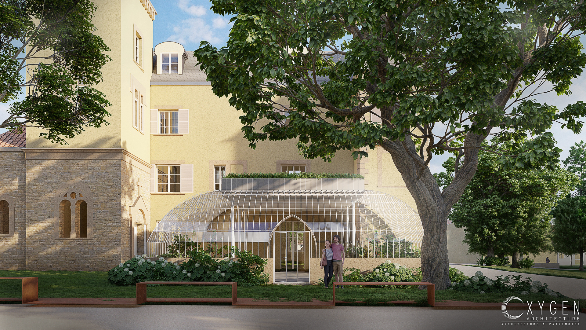 • Variante 3 : une extension inspirée des serres et constructions du XIXe siècle, caractérisée par des volumes arrondis et transparents soutenus par une ferronnerie blanche, et couronnée par une toiture-terrasse. Cette variante renvoie à l’esthétique des jardins d’hiver traditionnels.